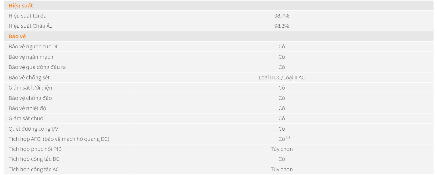 • Trang bị 10 bộ MPPT độc lập, hiệu suất chuyển đổi tối đa 98,7%.